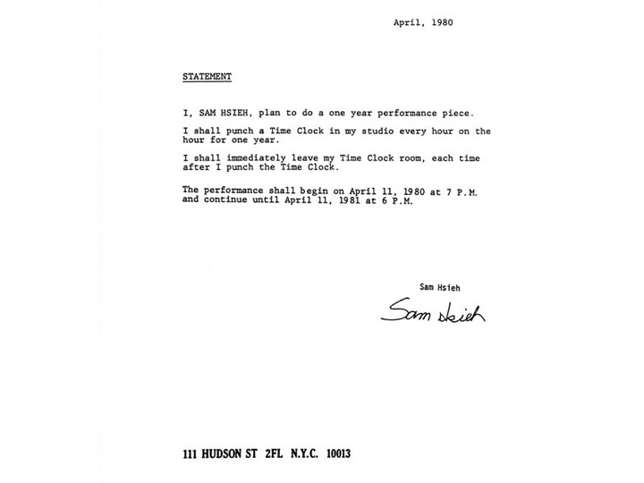 When thinking of the appropriation of workplace conventions in Tehching Hsieh’s One Year Performance 1980-1981―time clock machines, punch cards, office uniforms, and security cameras―we might ask what he was doing in the intervals between these hourly gestures. Was his output, as it were, restricted to these acts or was he moonlighting on the side? The appropriation of only the formal structure of conventional employment―a temporal schema―provides the only ‘content’ in Hseih’s work. In this sense, time has indeed become the artists’ medium. Yet it was still necessary to appeal to third parties (if not direct employers) in order to keep track of his progress and ratify the authenticity of his work. All of the artist’s durational performances relied on the use of contracts; each of his punched cards were witnessed by signature. Even as his own employee, Hsieh’s works ironically implicate the ever-present bureaucracies of regular employment, emphasising the dominance of capital as well as the systematic procedures that bind the activities of the legal alien, registered citizen and surveilled subject alike.