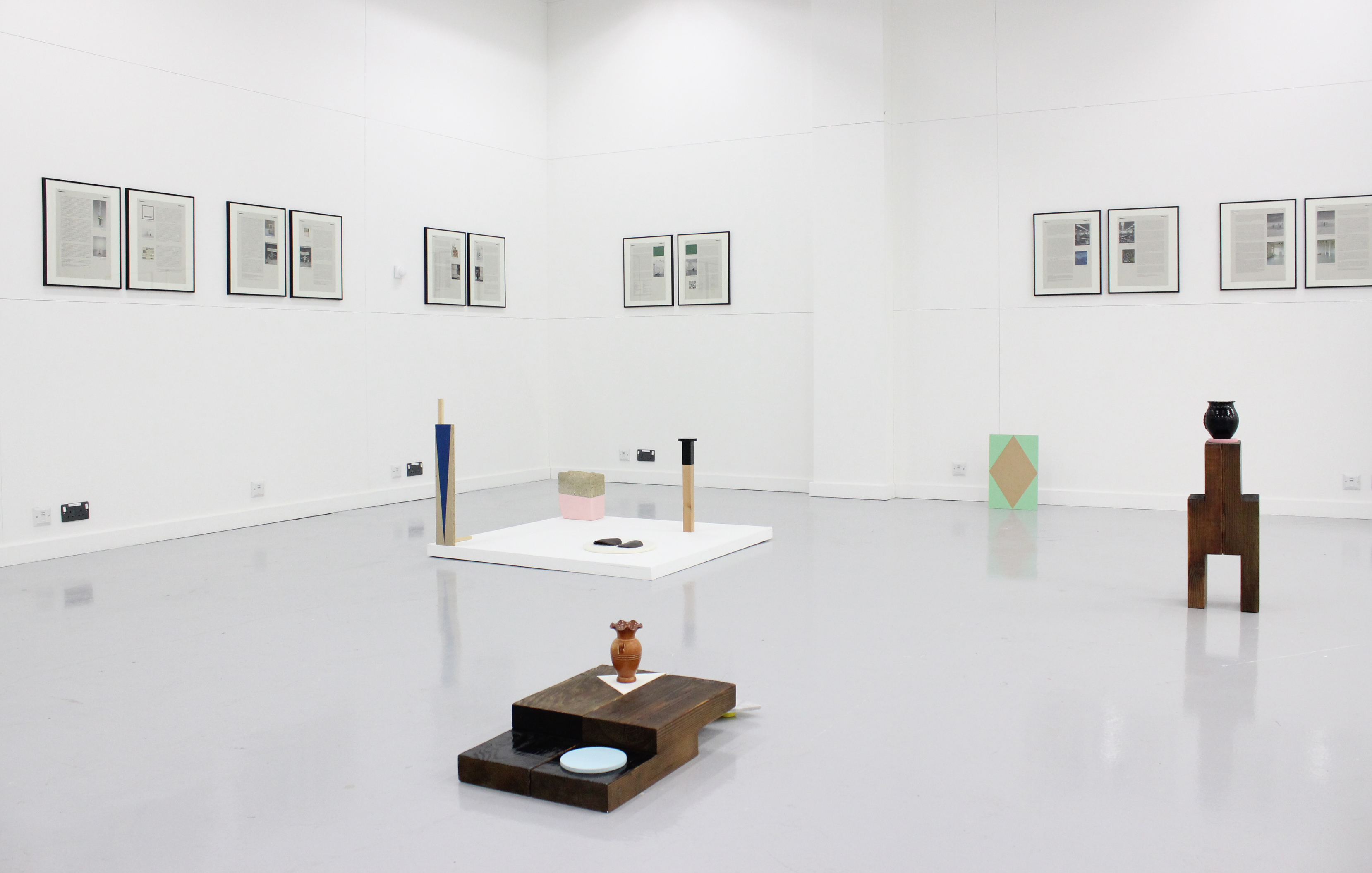 Objects of Conjecture (2015) is a collaborative work by Sarah Hughes and David Stent, exhibited at Hardwick Gallery, Cheltenham, which poses questions regarding orders of dependence between an exhibition of three-dimensional sculpture and an associated body of writing. Part of this concern is addressed toward exhibition conventions whereby a physical exhibition is accompanied by a printed document, often serving to contextualise the show and provide information that can be taken away. Here that convention is both acknowledged and subverted, with an extended ‘essay’, ‘Lumpen Structures’, replete with images and references, serving to provide speculative commentary on the sculptures as well as becoming implicated in the exhibition itself.